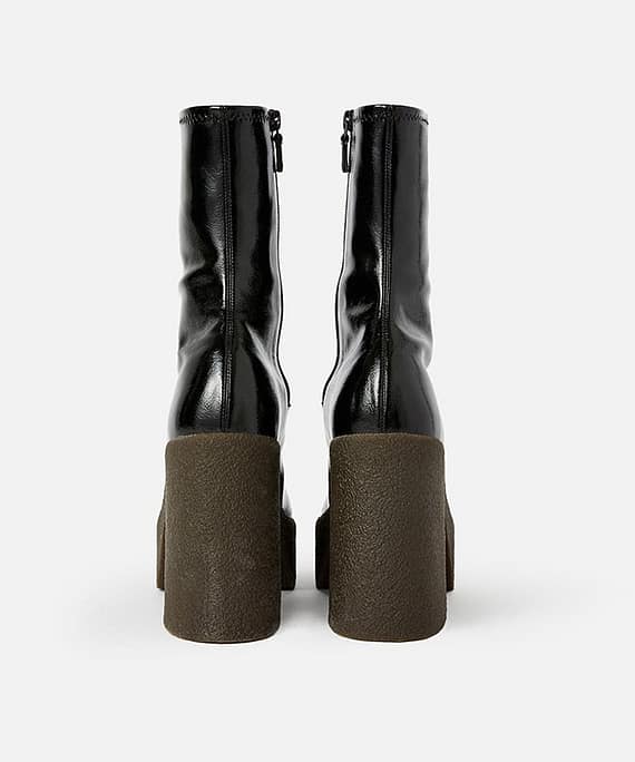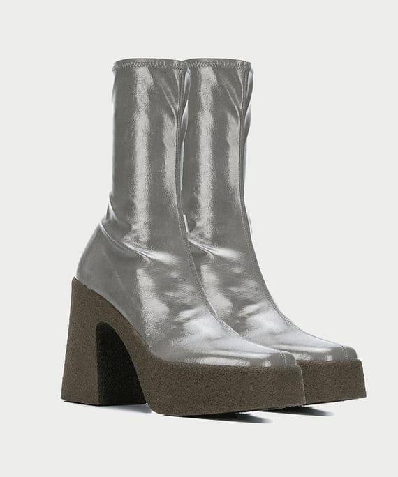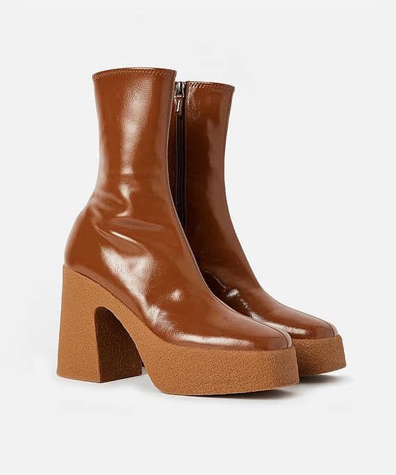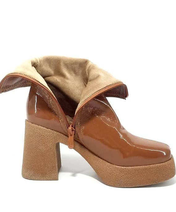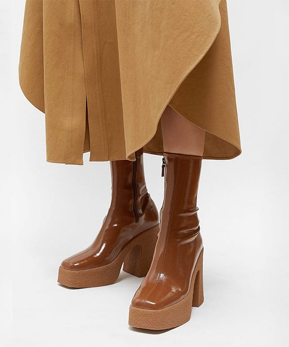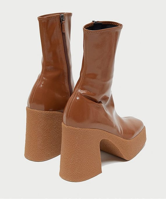 These chic, statement platform high heel boots are crafted with a glossy, patent leather finish available in rich caramel brown, vibrant black and eye-catching greyish silver hue, ideal for adding a retro flair to your outfit. The tall, structured shaft hugs the ankle for a sleek, fitted look, while the high block heel and thick platform provide both height, stability and comfort.